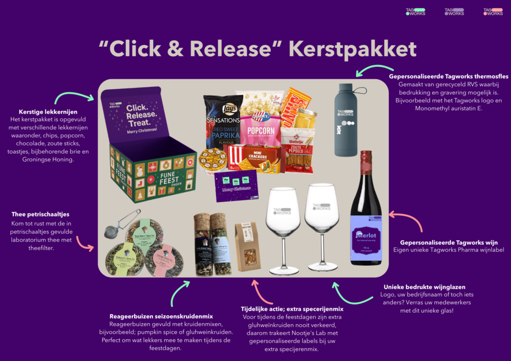 In december 2025 heeft Nootje’s Lab voor Tagworks 32 gepersonaliseerde kerstpakketten mogen leveren. Hierin zaten diverse lekkernijen, een gepersonaliseerde Tagworks wijnfles met bijpassende wijnglazen, laboratorium petrischaaltjes met verschillende soorten thee, kruiden reageerbuisjes, en een graveerde thermosfles met hun logo en Click-to-Release molecuul.